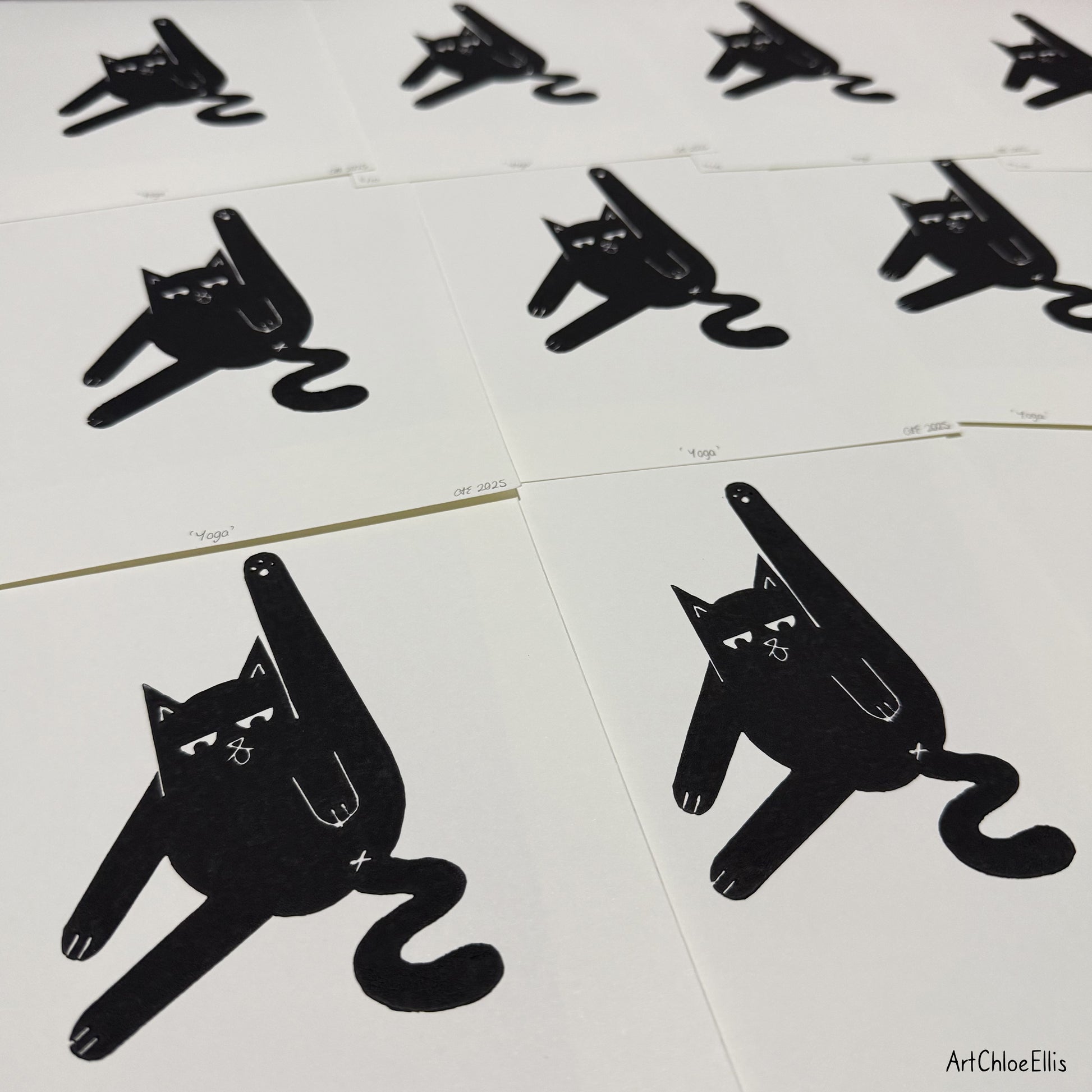 This print is inspired by the positions cats often contort themselves into in order to clean their fur, showing a cartoon-ish cat in a yoga-like position to lick itself.